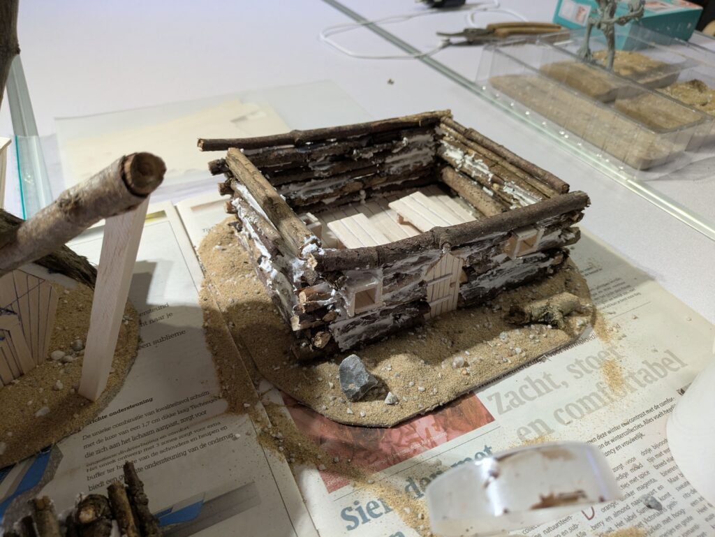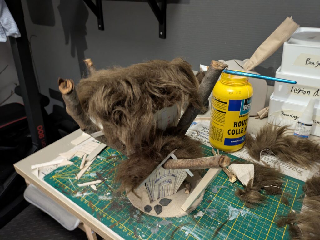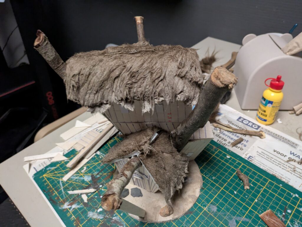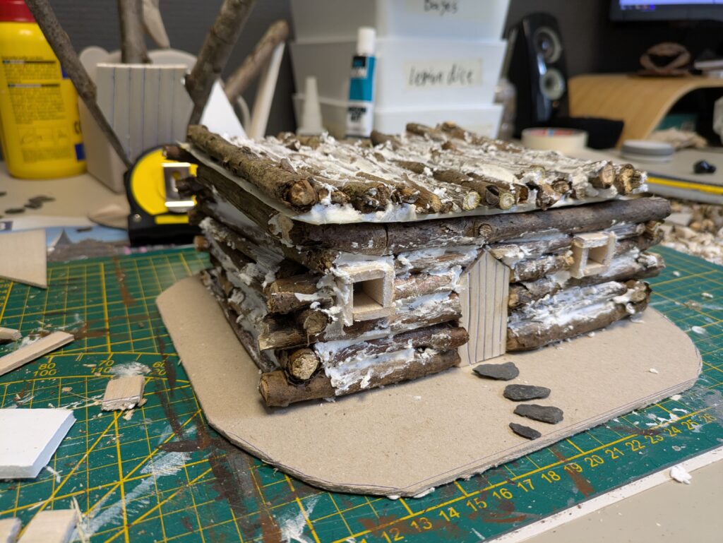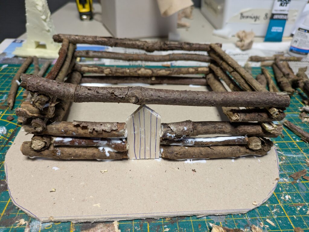 2. I cut a 3 mm thick cardboard to form the base. My base is about 24 by 21,5 cm. I then cut the twigs to size and form the ‘skeleton’ of the house. Use test models to see how tall you want to make the cabin. For me, I wanted Radagast but also Beorn (man form) to fit through the door. My cabin is therefore a bit taller than in the magazine (about 7 cm without the roof).