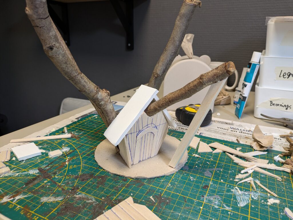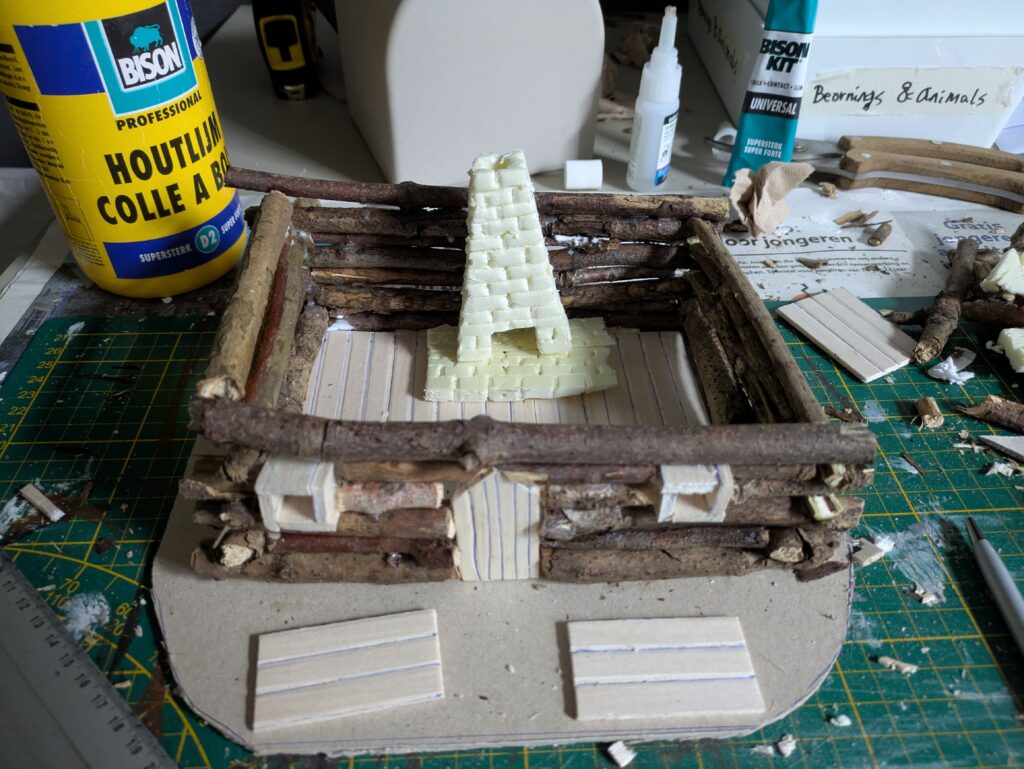 3. For more visual interest, I made two windows that also give a bit of a birdie vibe. This does create some hassle, because now it will be harder for the twigs to align properly. I therefore decided to not place any windows on the other sides of the cabin. I also cut XPS foam for the chimney, as well as cut some balsa wood for the interior flooring. I also made two wooden tables out of balsa wood.