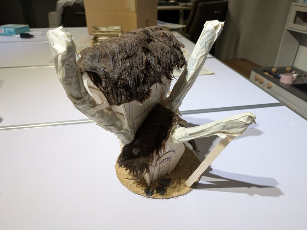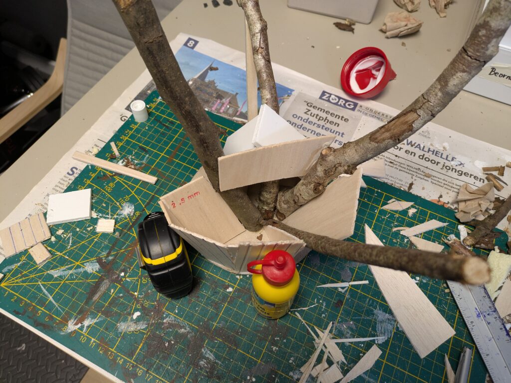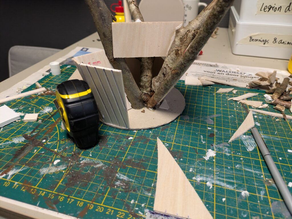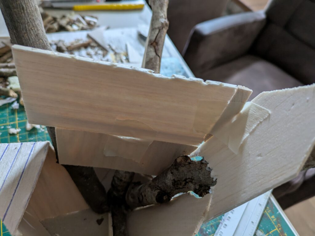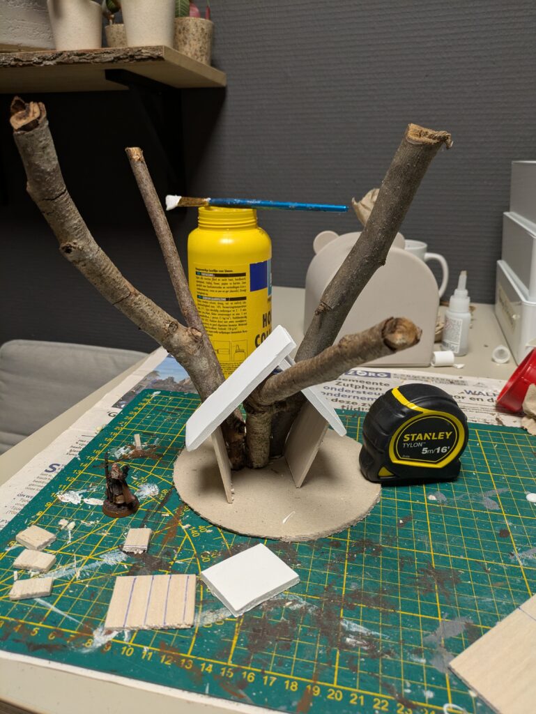 2. I cut a 3 mm thick cardboard in a circle of about 15 cm/6″ diameter. I then positioned the twigs in a way that somewhat matches the reference image above, but also makes it practical enough to build a house around, in as few straight foamboard pieces (for the roof) and balsa wood pieces (for the walls) as possible. I used PVA glue where I had twig-on-twig contact, as well as super glue to glue it to the base. I also used a nail to pin two twigs together.