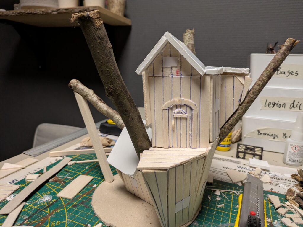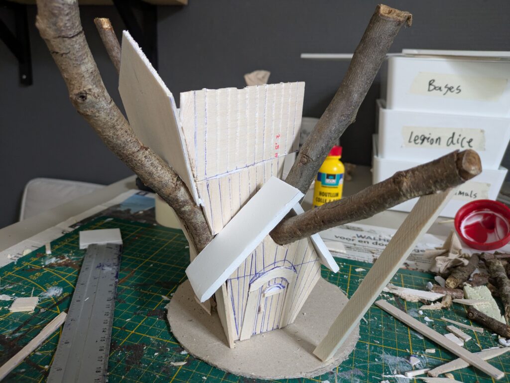 8. We are almost done building Radagast’s House. One final detail I do not want to omit is the bird’s house that can be seen on the reference image. For that, I will use a small twig and some thin balsa wood (1 mm). To make painting easier, I will leave the separate for now. Finally, I base the base with sand and small stones. I glue some stepping stones leading up to the front door (using slate chippings) and a few larger rocks on the base. All ready for painting and priming!