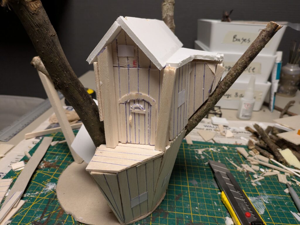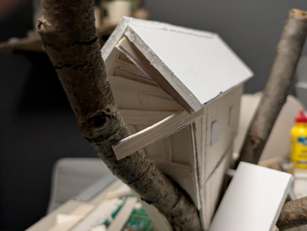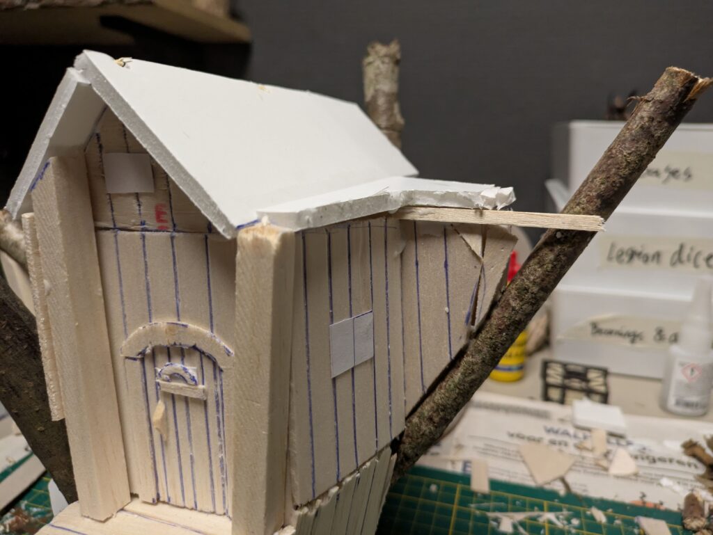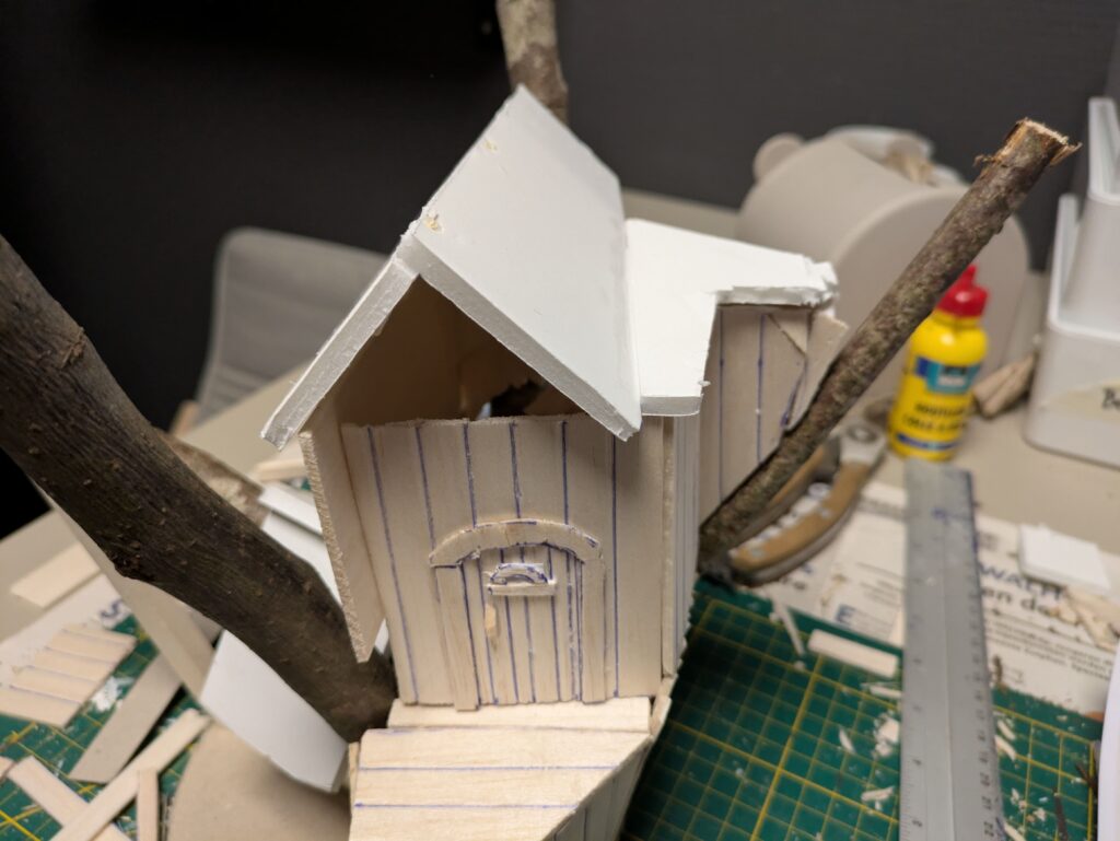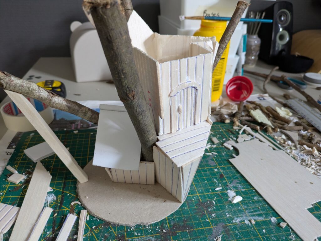 3. Once everything is fully dry and bonded, it is time to actually build the house. To save time and make it less of a hassle, I used whole pieces of balsa wood (2,5 mm thick) that I drew lines on approximately every centimetre. By drawing deep and perhaps even making light cuts, this creates the illusion of different planks. I suppose it would be more detailed to cut individual planks, but that would take a lot more time and effort and would probably not line up as nicely, unless you’re really neat and precise. If it’s hard to glue, you can use masking tape to let the pieces stay in place.