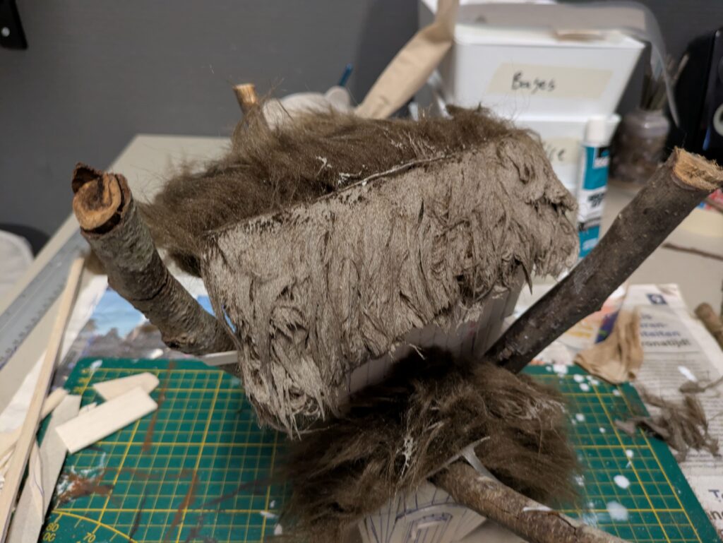 7. There will now be a ‘naked’ strip between the two sides of both roofs. We will solve this by glueing another piece of synthetic fur, generously along this strip. This strip will get the same PVA/water treatment as in step 6.