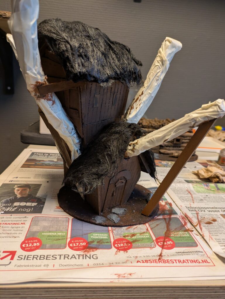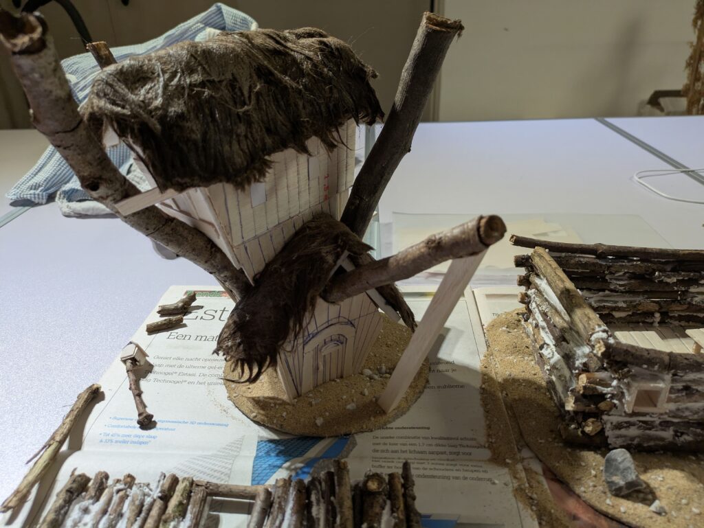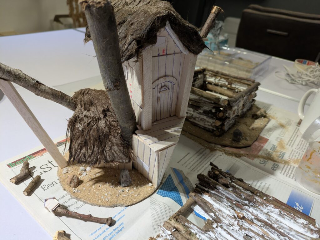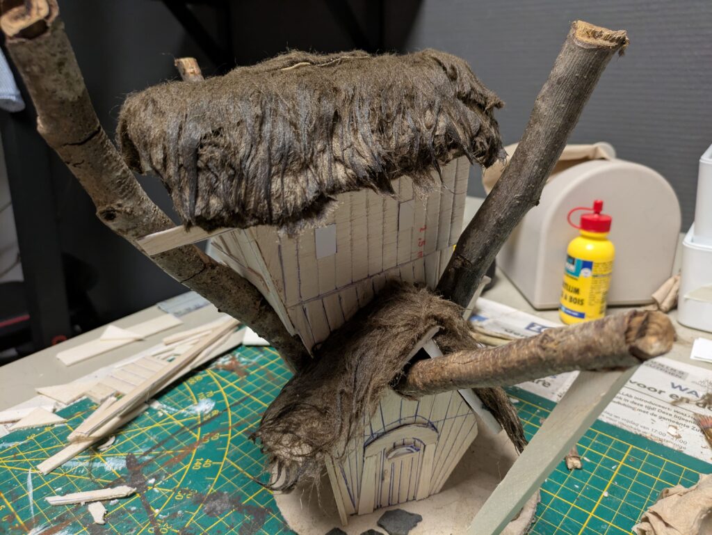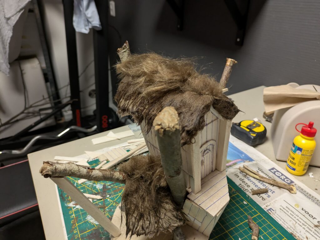 5. Before adding the synthetic fur for the roof, it is time for the final details (for now). There are some loose planks at the top that are nailed to the tree. I also decided to add some pillars on both sides of the door on the second storey. Finally, I used heavy paper cut in 1 by 1,5 cm rectangles to be used as windows.