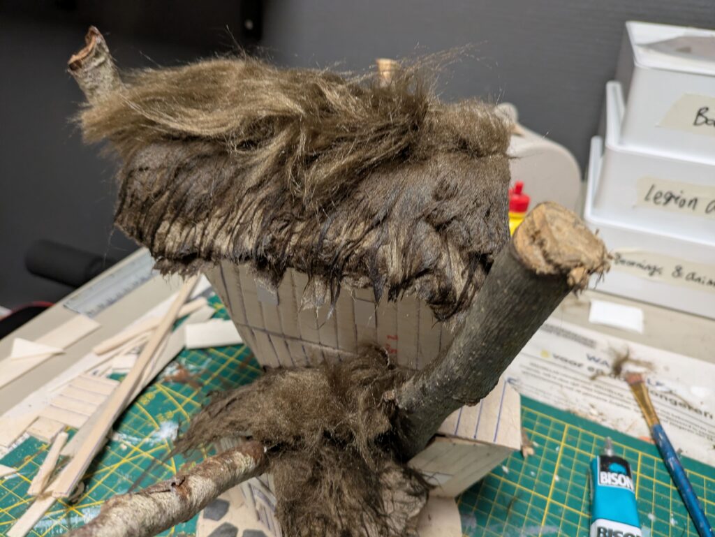 6. I glued the synthetic fur to the foamboard roof using PVA glue, one piece for every side. Once dry, I used a 50:50 PVA:water mix and brushed the fur upright. When the fur is completely soaked, I used the same PVA glue and water mix to brush the fur downwards. This creates the thatched roof look, as described in Battle Games in Middle-earth Magazine #50.
