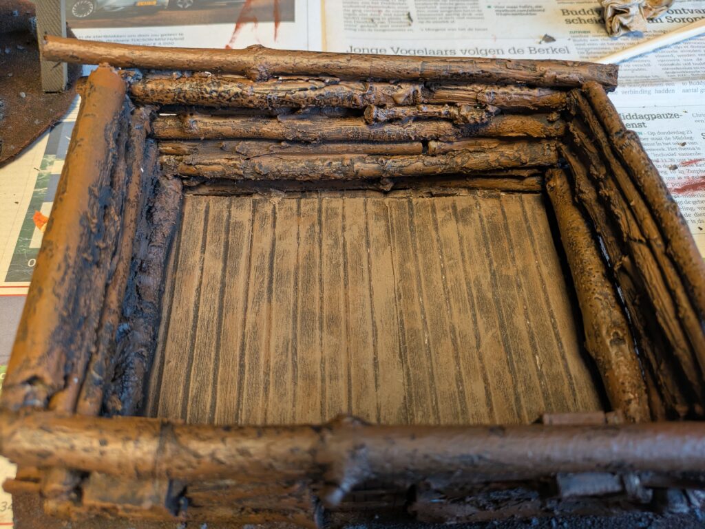 4. The roof will be a separate piece, so that you can use the interior. For this I used foamboard that I cut to size. I then covered this with twigs, which I glued down to it. There’ll be holes all over the cabin, but not to worry! I used filler from the hardware store to fill the gaps.